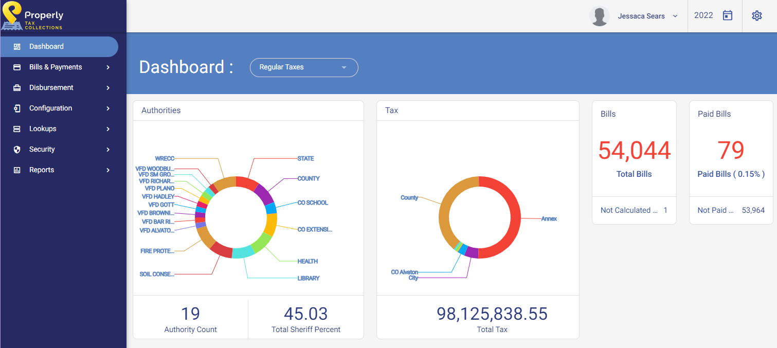 The Dashboard screen is the first screen to appear once a user has logged into Properly Tax Collection.
